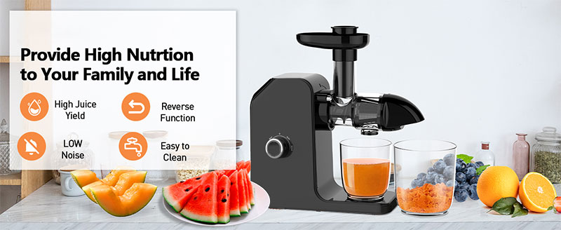 High yield: The extrusion juicer uses a powerful 150W motor to efficiently extract juice from a variety of fruits and vegetables, resulting in high juice yields. The slow juicer can handle celery, apples, carrots, ginger, wheatgrass, leafy greens and more.