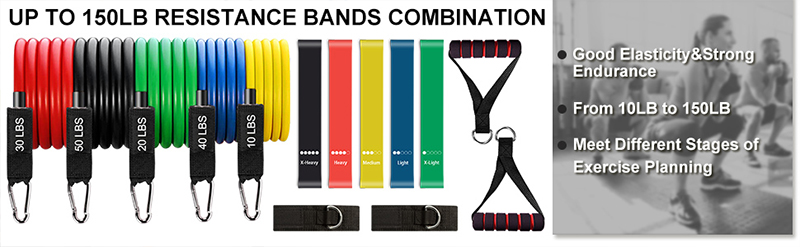 Adjustable Resistance Bands with Handles: Includes yellow(10Lbs), green(20 Lbs), red(30Lbs), blue(40 Lbs), black(50 Lbs). The bands can be used alone stacked in any combination to a maximum equivalent from 10lb to 150 lbs.